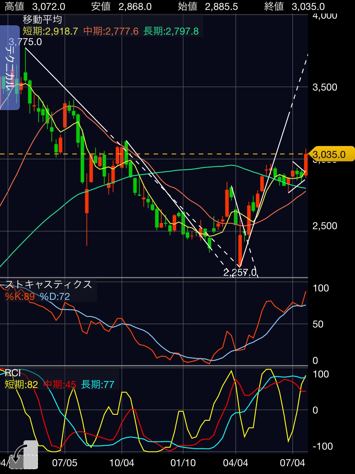 来週はらみ線になれば形が悪くなりますが、直近高値3,132円を越えれば形はよくなるかと思います。
