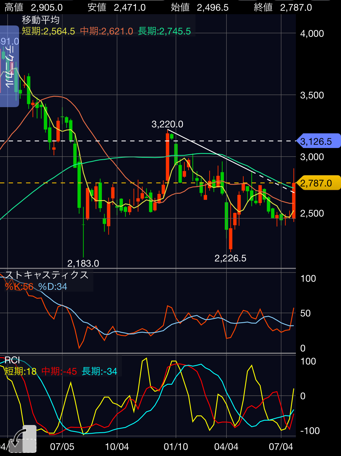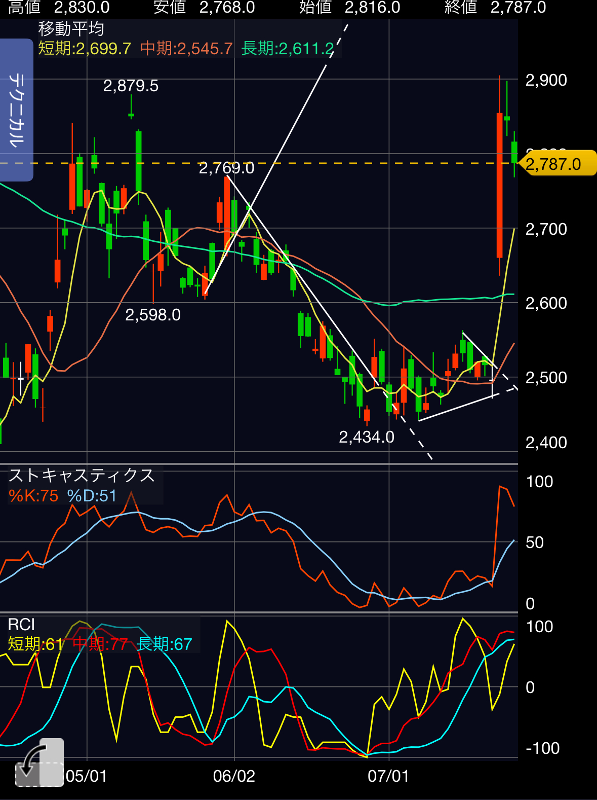 焦点は半分上ヒゲの2,770円を維持できるかに加え、短期MAが追いかけてきていますから、ここを割らないか、というところかと思います。