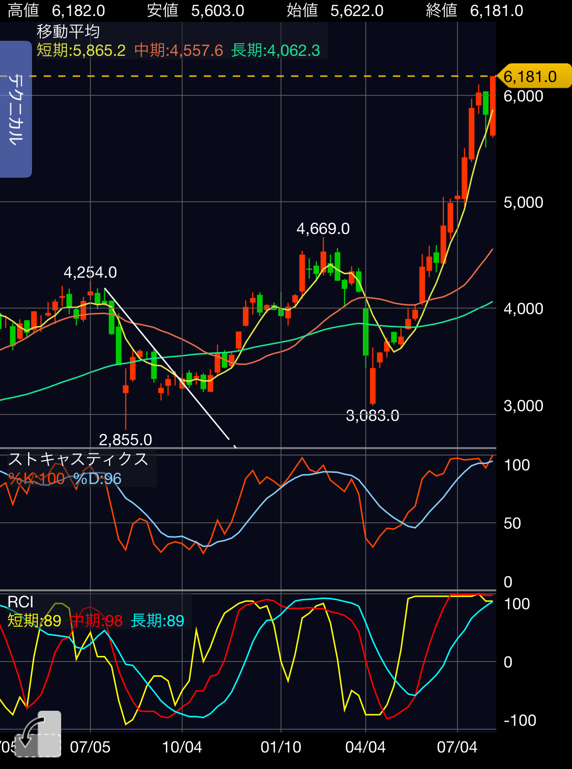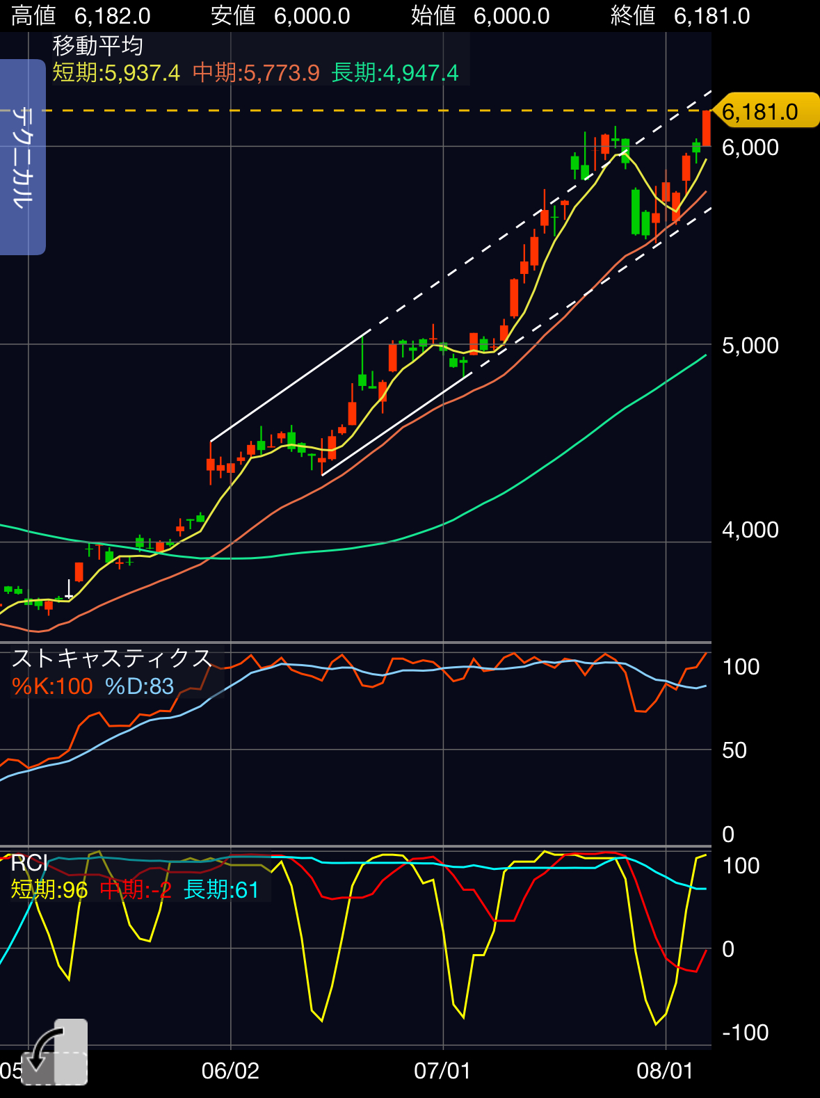 ストキャスもまた100に達し、RCIの短期線も96と、いつ調整を迎えてもおかしくない数値ですが騰勢が強いとオシレーター系は高水準を維持したまま上昇することがあります。