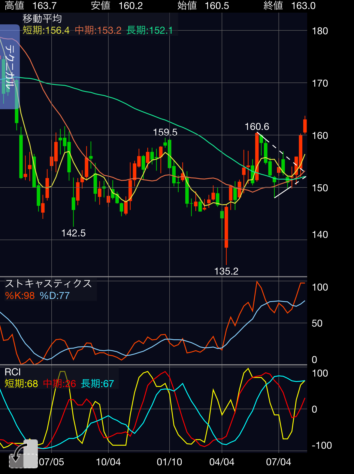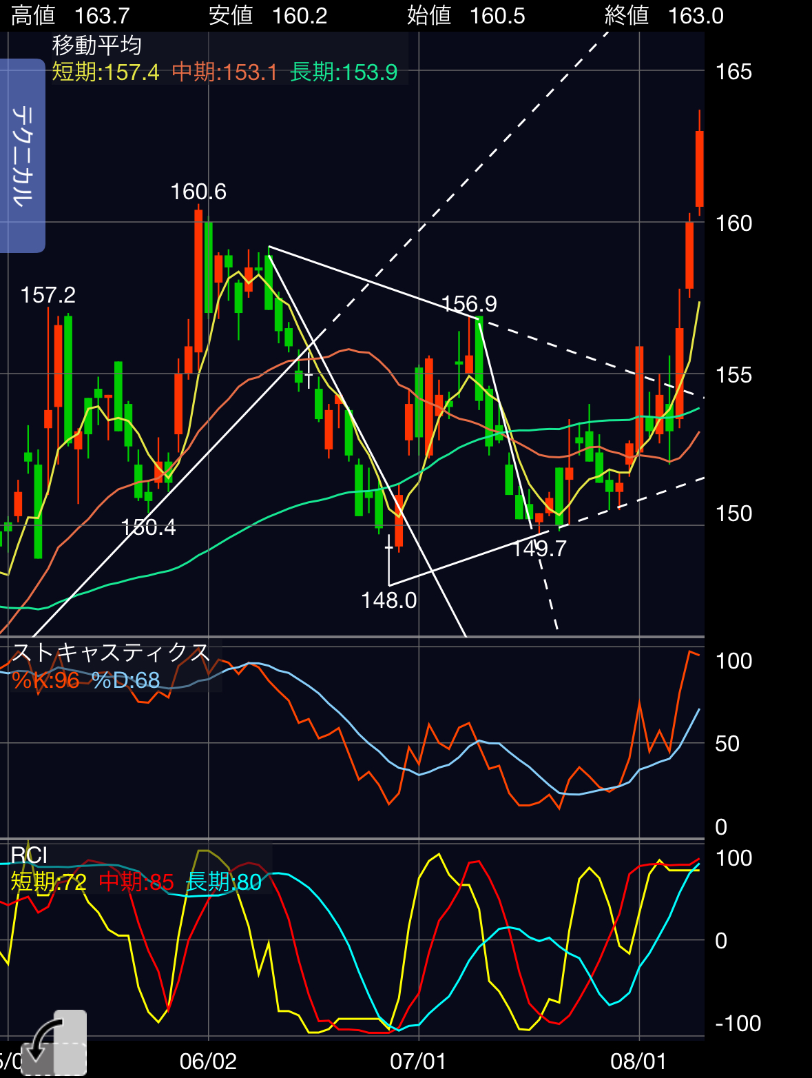 過去1年の上値となってきた160円をついに明確に越えてきました。これでひとまず過去1年に買った保有者はみな含み益となり「やれやれ売り」の圧力は和らぎつつあるとの見方もできようかと思います。