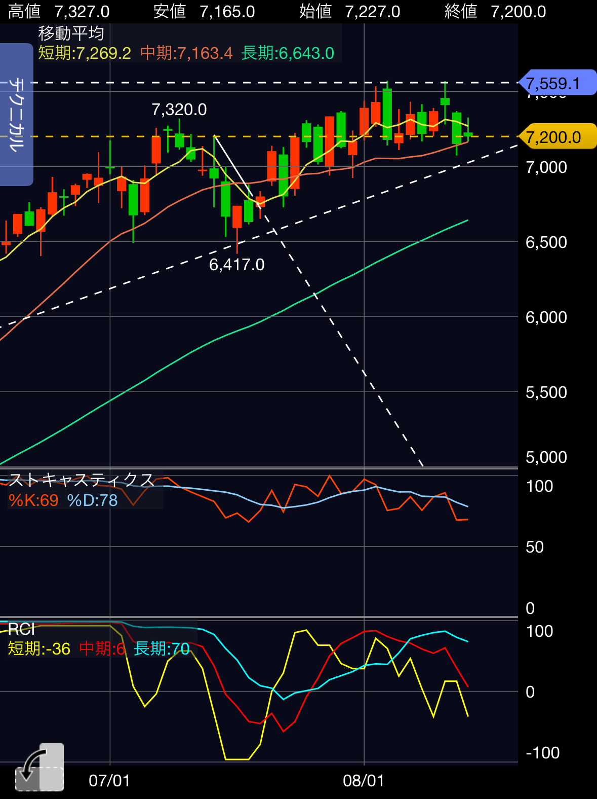 短期MAを割り込みましたが、中期MAに依然支持されており、下方向は中期MAを割るかが焦点であり、上方向はまず短期MA、その先は高値7,560円が節目かと思います。