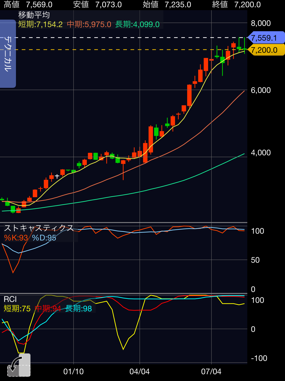 - 日足:包み線、ゼブラと来て高値圏で「宵の明星」を形成し、はらみ線。焦点は、下は中期MA、上は短期MAと高値7,560円
