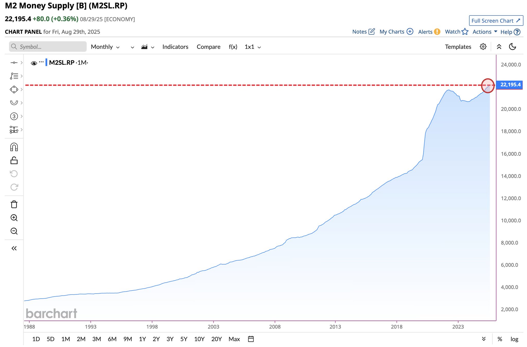 米国のM2(マネーサプライ、貨幣供給量)は過去最高の22.2兆ドルに達しました。M2が高まれば、株とビットコインが上昇する傾向にあります。M2が足もとの株式市場を支えている大きな一因とみられます。