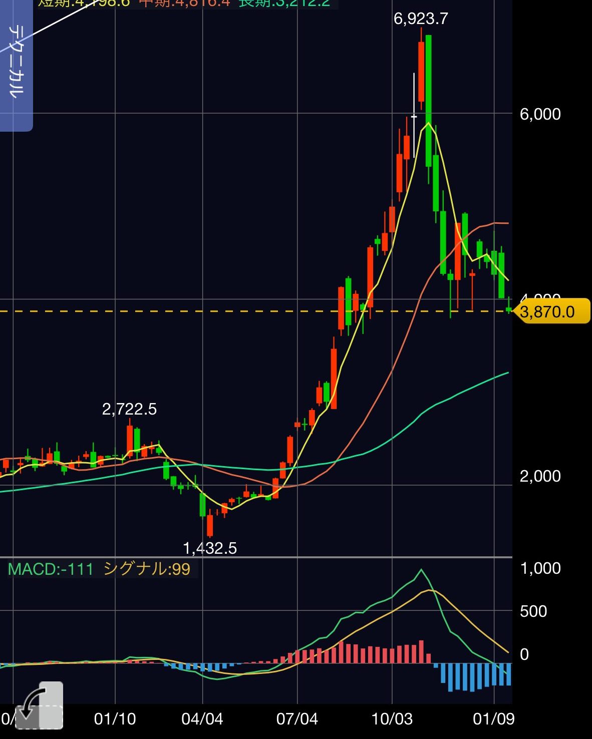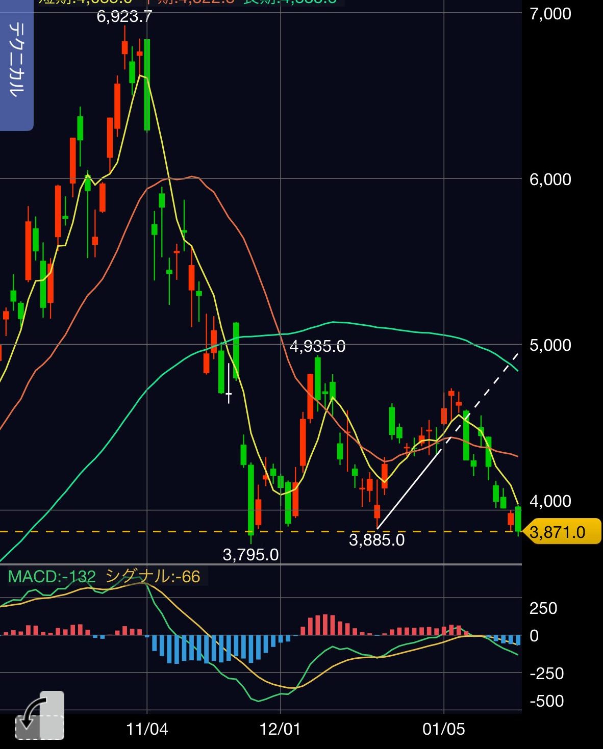あくまで週半ばなので週足未完成ながら、本日終値3,851円で区切ればトウバ(塔婆)、つまり墓標が立った形。推して知るべし、テクニカル的には決してよい形ではありません(笑)
