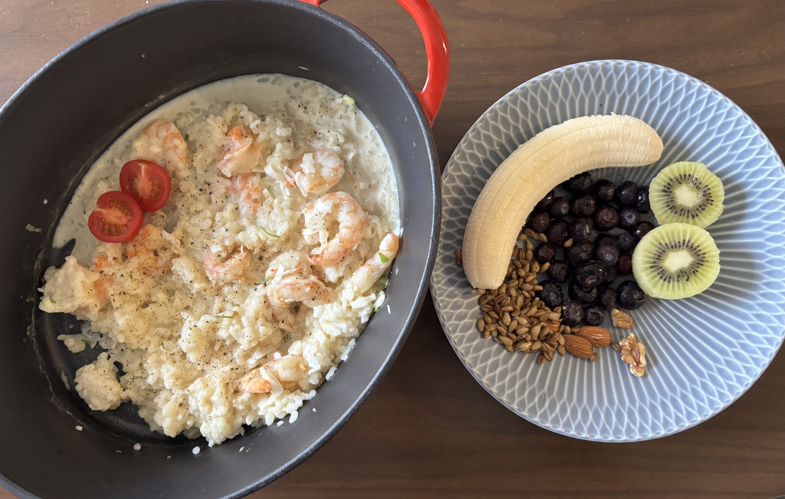 • 左:天然むきえび(冷凍)、五分づき米、刻みねぎ、ミニトマト、レモン汁、塩コショウを加えた豆乳リゾット。美味しいです。
