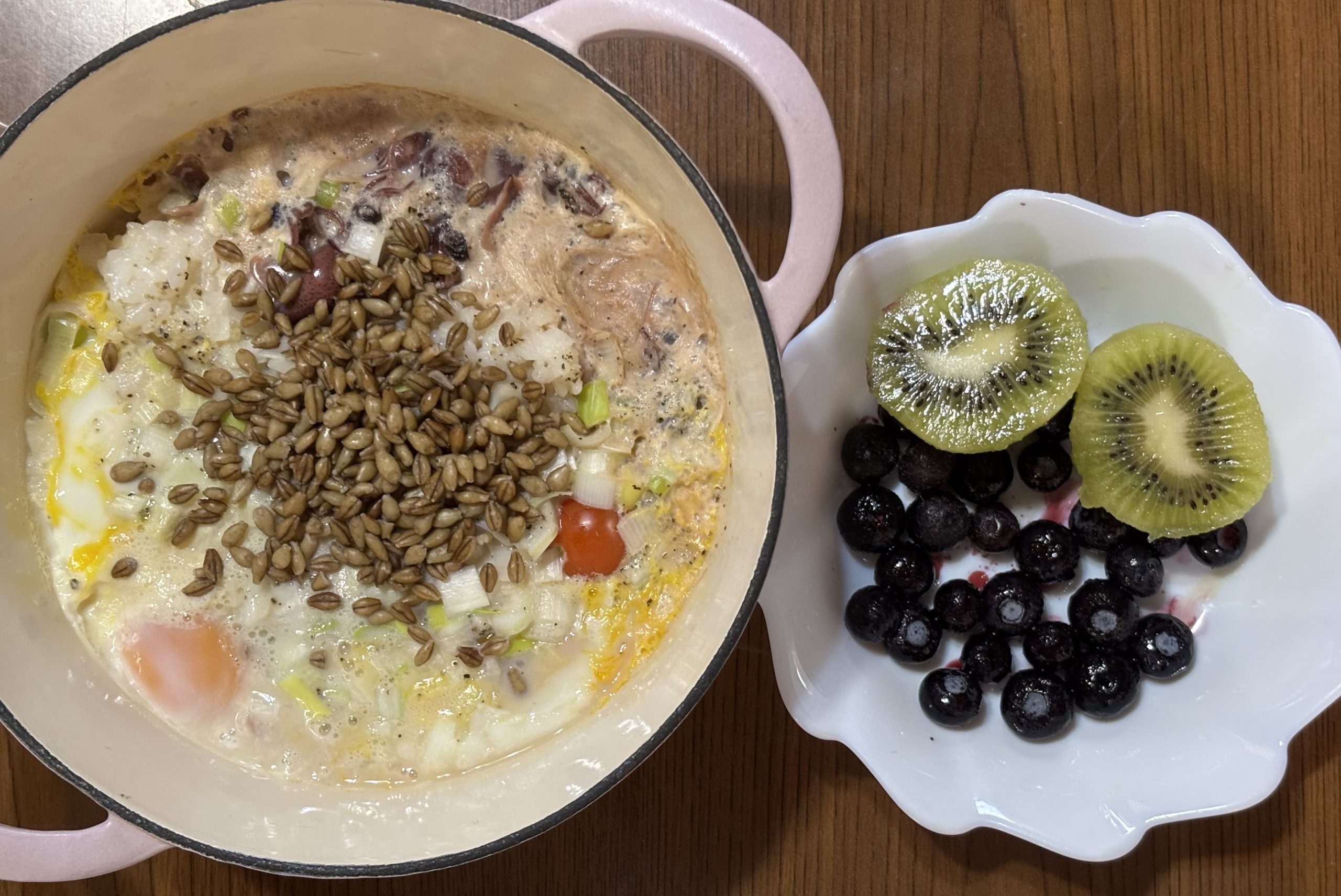• 左:おじや(卵2個、大麦、ほたるいか、ミニトマト、刻みねぎ、無調整豆乳)