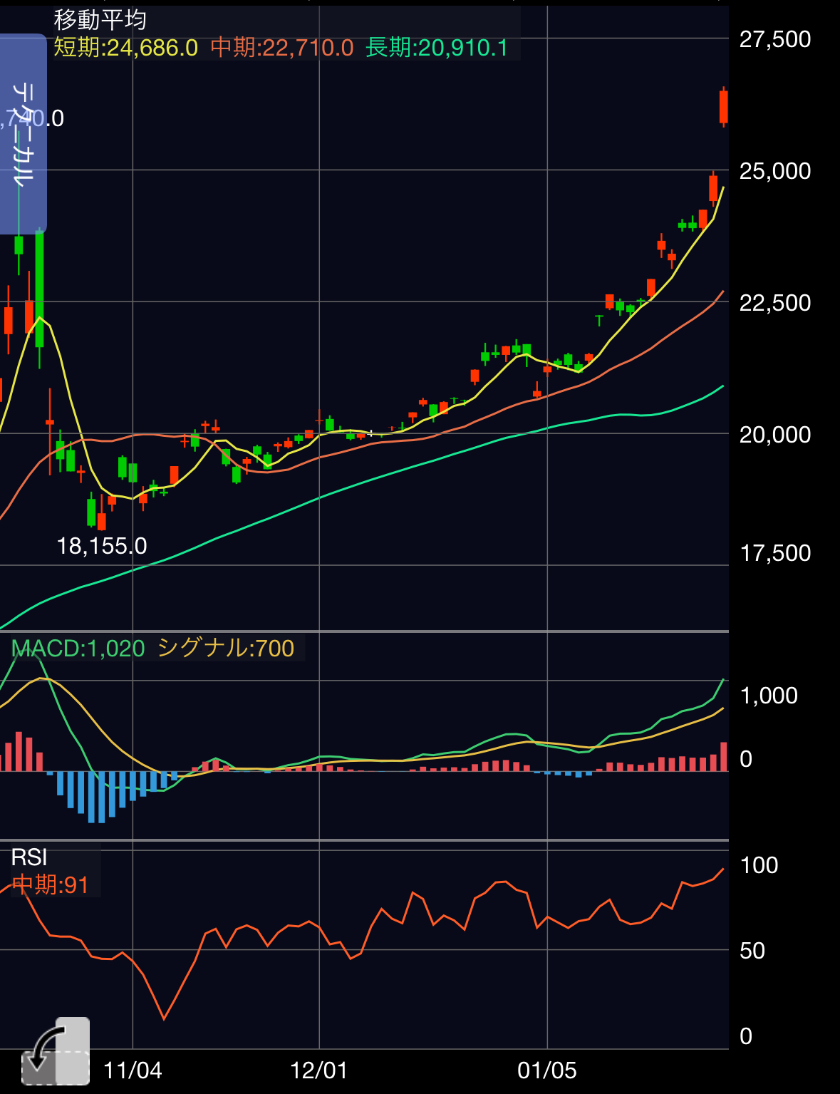RSIなどにおいては短期的にやや過熱感が出てきた一方、MACDは依然上向きという状況。
