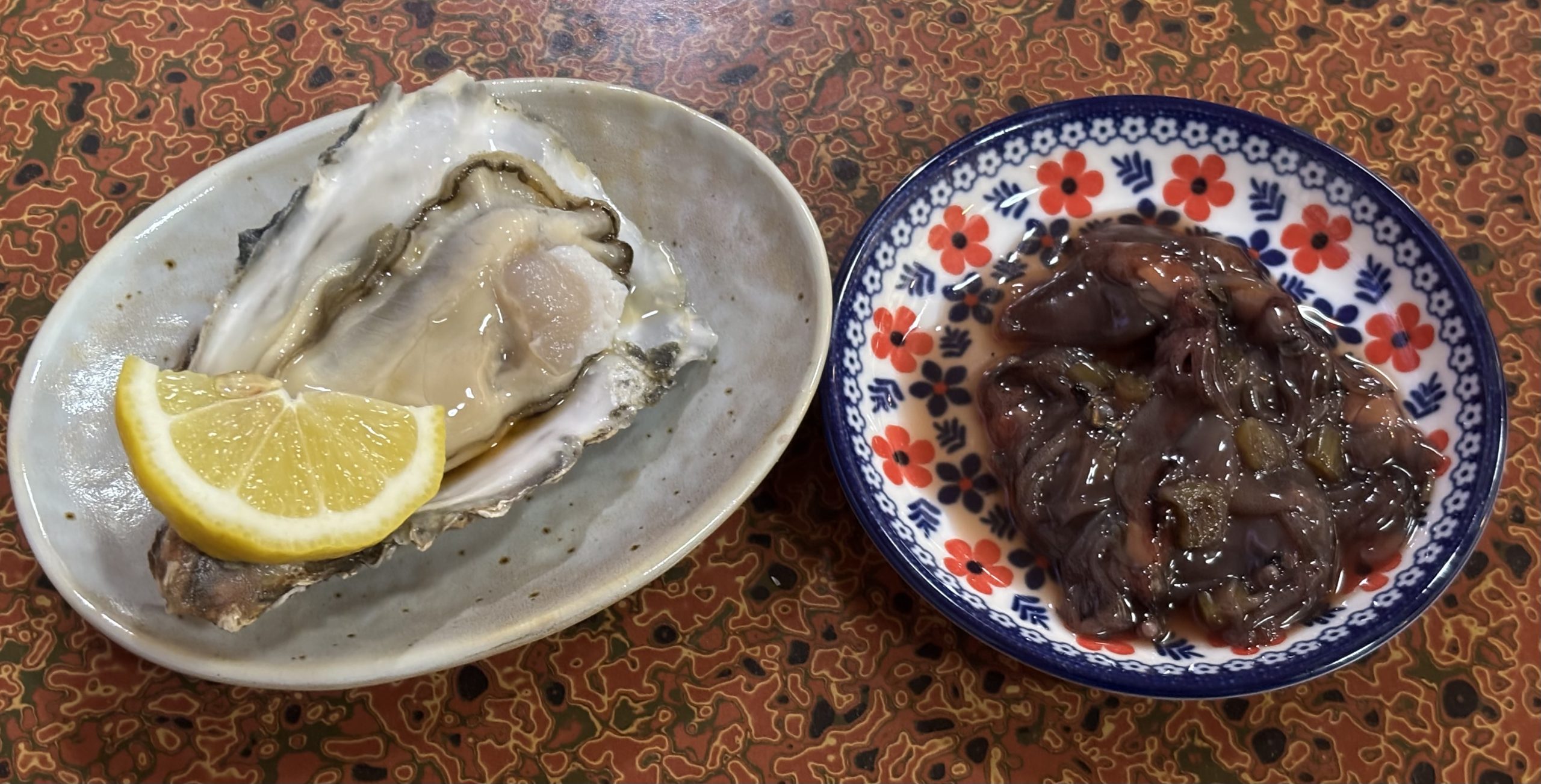 厚岸の生カキ、ホタルイカのわさび漬け。